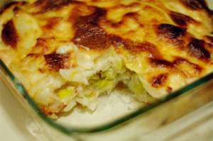 4. Die Porreestangen aus der Pfanne in die Form auf die Kartoffeln legen und den gekochten Schinken in ca. 2 cm breite Streifen schneiden. Die Streifen werden über die Porreestangen gelegt. Hierüber wird die Käsesoße verteilt. Hiernach wird die Form in den Ofen geschoben und der Porree ca. 2o Minuten überbacken. Zum Schluß wird die gehackte Petersilie über das fertige Gratin gestreut.